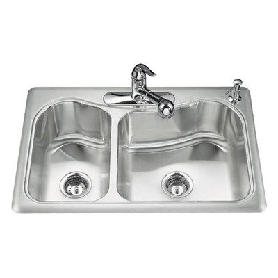 K-3361+3 Faucet Holes: 3 Photo shows kitchen sink with four-hole faucet punching. Coralais faucet and soap/lotion dispenser.(Not Included) The Staccato Double Bowl Self-Rimming Kitchen sink is made of 18-gauge stainless steel and has a design that will please. SilentShield provides reduction of noise and vibration from dishes and running water. This model has included hardware and the choice of one, three, or four-hole faucet drilling. The Coralais Pullout Spray, cutting board, basin rack, and sink strainer are all optional additions you can make to your Staccato Double Bowl. Sink Features: -Available with 1, 3, or 4 hole faucet hole drilling -Accessories not included -18-gauge stainless steel -SilentShield reduces disposal noise and vibration from dishes and running water -Hardware included -Water depth: 8'' (both bowls) -Overall dimensions: 8.31'' H x 33'' W x 22'' D Staccato Specification Sheet Staccato Installation Instructions Staccato Homeowner's Guide and Service Parts Faucet Features: -Polished chrome finish -Available seperately in the following finishes: biscuit, black black, vibrant brushed nickel, white, brushed chrome -Temperature memory allows faucet to be turned on and off at any temperature setting -Loop handle -High temperature limit stop for added safety -Touch Control for stream to spraywater flow -Integral vacuum breaker protects water line from contamination -10'' escutcheon plate for three-hole installation -All metal construction ensures durability and long life -Overall dimensions: 11.63'' H x 10.5'' W x 9'' D Antique Bar and Pantry Faucet Specifications and Measurements Coralais Pull-Out Spray Kitchen Faucet Installation Guide Cutting Board Features: -Hardwood construction -For use with Staccato double equal sink -Ideal for kitchen workstation Sink Strainer Features: -Available in the following finishes: polished chrome -Removable sink strainer without tailpiece -Strainer is for sink installations with 3.5'' or 4'' outlets -Solid brass cons