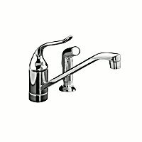 Kohler K-15176-F-CP Coralais Single-Control Kitchen Sink Faucet with 8-1/2" Spout, Color-Matched Sprayhead and Lever Handle, less EscutcheonPart of the Coralais collection, this single-control kitchen faucet offers affordable quality, style and dependability with a temperature memory that retains desired water temperature. A high-temperature limit stop makes it easy to preset a comfortable temperature. Thanks to the ceramic disc valving, you can enjoy precise water control while your faucet resists wear and debris. The contemporary/transitional styling gives you the versatility to accommodate a variety of decorating schemes. Fast, easy installation gives you immediate satisfaction.Color/Finish: Chrome (-CP) Model Number: K-15176-F-CP Flexible supply lines provide an easy, fast installation3/8" fitting on hoses fastens directly to stops for convenient hookupChrome sidespray for chrome kitchen faucets provides matching finish spray and faucetSpecifications