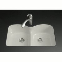 Kohler K-6626-6U-IG Langlade Smart Divide Undercounter Kitchen Sink with Six-Hole Oversized Faucet DrillingBridging the gap between form and function, and proving that sometimes less is more, Smart Divide kitchen sinks feature an innovative low-profile divider to better accommodate large pots and help keep water where it belongs. This durable Langlade Smart Divide undercounter mount kitchen sink, constructed of KOHLER Cast Iron, will stand up to years of rugged use while maintaining its rich, lustrous sheen.Features:Color/Finish: Ice Grey (-95) Model Number: K-6626-6U-95 The Smart Divide low profile basin divider (patent pending) offers ease of handling large items within the sinkConstructed KOHLER Cast IronExterior dimensions: 33" x 22"Interior dimensions: 15" x 18-3/8" (left basin), 15" x 18-3/8" (right basin)Basin depth: 9"Double equal basin sinkUndercounter installationSix-hole oversized faucet drillingSpecifications